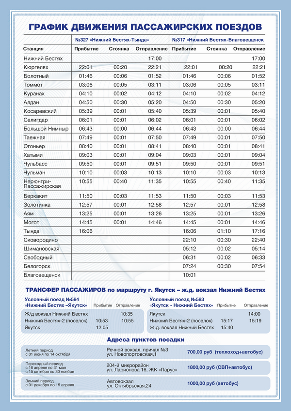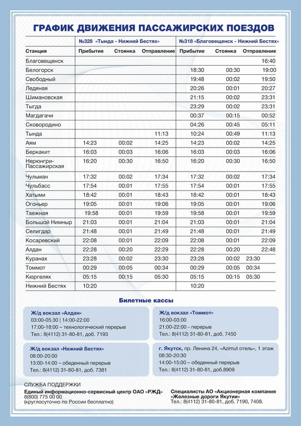 С 15 декабря вносятся изменения в расписание движения пассажирского поезда №328 Тында — Нижний Бестях. Новое время отправления со ст. Тында в 11:13 (на 51 минуту позже). Прибытие на ст. Нерюнгри-пассажирская в 16:20 (на 50 минут позже), отправление ст. Нерюнгри-пассажирская в 16:50 (на 54 минуты позже). В Алдан пассажирский поезд прибывает в 22:28 (на 44 минуты позже), отправляется в 22:48 (на 34 минуты позже). В Томмот прибывает в 00:29 (на 34 минуты позже), отправление со ст. Томмот в 00:34 (на 26 минут позже). Прибытие на ст. Нижний Бестях в 10:20 (на 20 минут позже).
