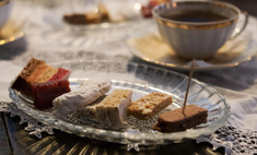 Дальше происходит удивительное: приглядевшись к содержимому тарелок, становится очевидно, что местная пастила не имеет к тому, что мы обычно подразумеваем под этим словом, ни малейшего отношения. Никаких тебе белых упругих брусков, вместо них ломтики плотно свернутых рулетов и слоеные кусочки соблазнительных ягодных цветов.
