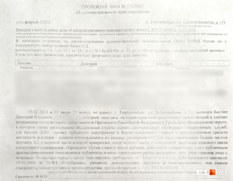 Там к нему подошли сотрудники Росгвардии. Сфотографировали и попросили документы. Спустя некоторое время Дмитрия задержали и увезли в пятый отдел полиции, рассказала E1.RU юрист Юлия Липинская, представляющая интересы Бахтиных. На екатеринбуржца составили протокол по статье «Нарушение участником публичного мероприятия установленного порядка проведения пикетирования» (