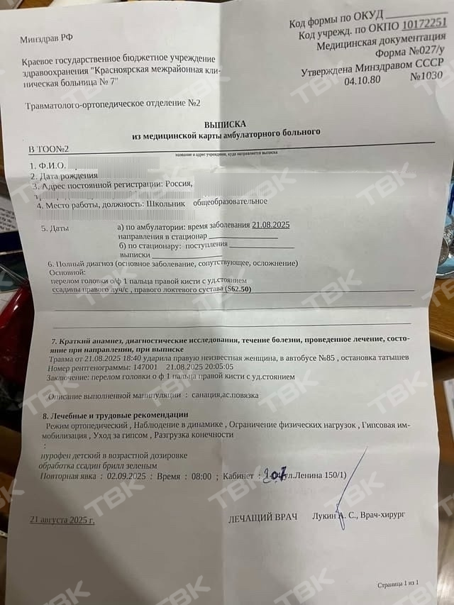 В редакцию ТВК обратилась красноярка и рассказала, что 21 августа ее сын ехал в автобусе №85. На одной из остановок в общественный транспорт зашла пенсионерка, которая грубой форме начала требовать, чтобы мальчик уступил ей место."Она зашла и сразу направилась в сторону моего сына. В грубой форме сказала ему: "Вставай, мне надо сесть". Ребенок ее проигнорировал. Тогда она начала хватать его сначала за футболку, потом поцарапала ему руку в двух местах до крови. Затем стала выхватывать телефон и в конце схватила за палец", - рассказала мама подростка. В итоге женщине сделали замечание один из пассажиров и кондуктор и отправили ее на другое свободное место.Спустя час после случившегося мальчик вместе с матерью обратился в травмпункт. У подростка диагностировали перелом фаланги пальца. Кроме того, медики зафиксировали у него ссадины.