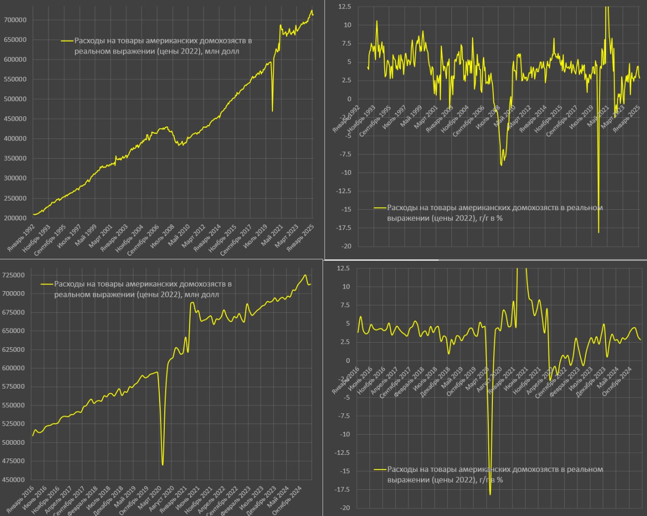Опубликованные данные не позволяют судить о развороте розничных продаж с рисками перехода к рецессии, т.к. месячные данные достаточно зашумленные, а тенденция еще не сформировалась.