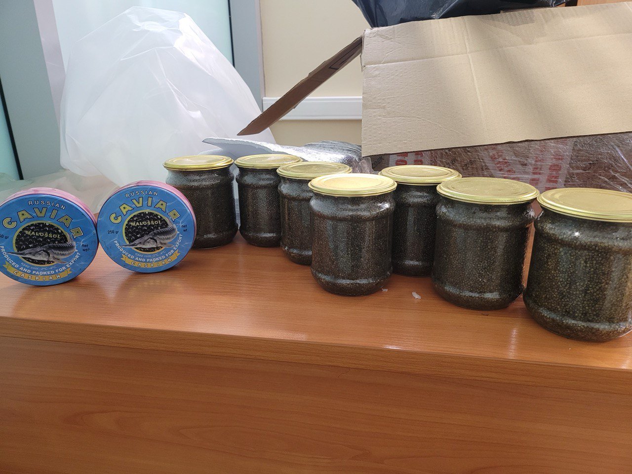 Как показала экспертиза, семь стеклянных банок являются икрой стерляди, две металлические банки — икрой амурского осетра. Общая стоимость составляет 341 850 рублей.