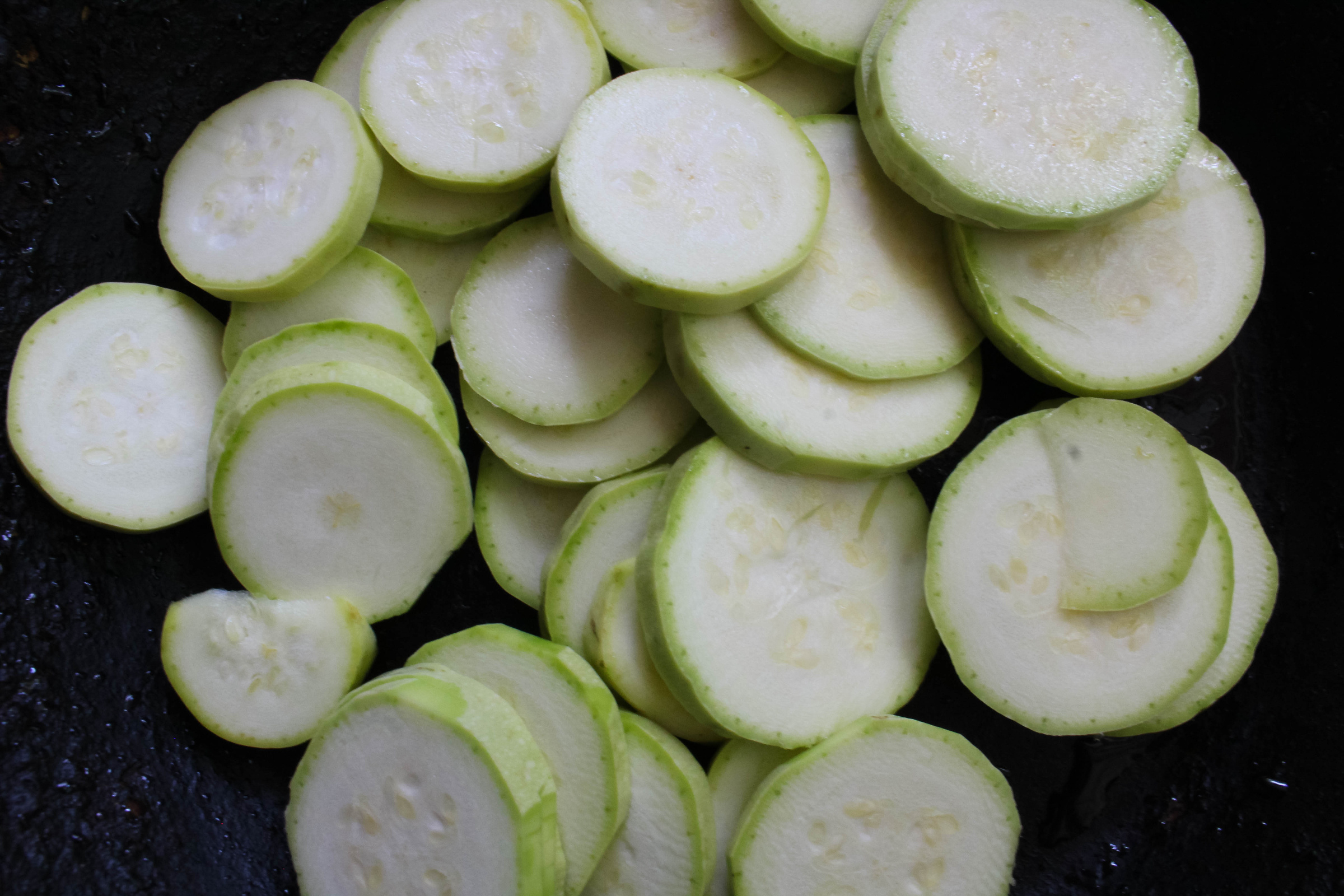 Кабачки нарежем не очень тонкими кружочками и выложим в посуду, в которой будете запекать блюдо.
