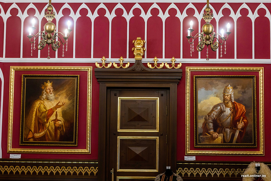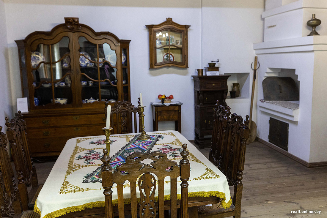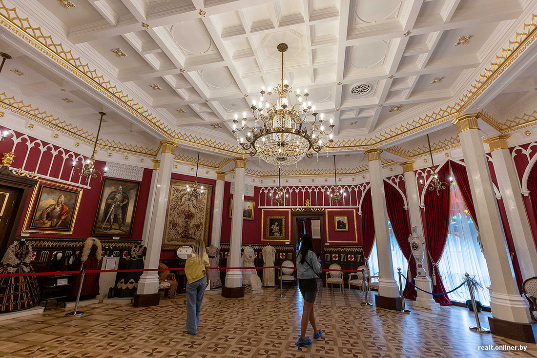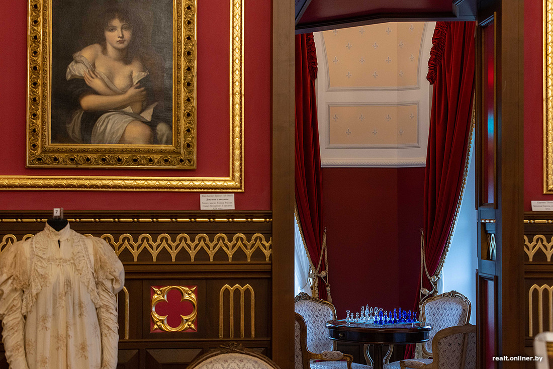 Коссовский замок стоял заброшенным, пока в 2008 году его не начали реставрировать. Закончили только в 2022-м. А потому ощущение, что это все-таки новодел, не покидает на протяжении всего пребывания внутри и снаружи. Слишком чистенькие, беленькие стены, слишком яркая позолота, слишком аккуратная роспись… А вот что действительно добавляет атмосферы, так это экспонаты музея. Тут вам и оригинальная мебель XIX века, и старинная одежда с различными украшениями, и посуда… Разглядывать все это можно часами. А еще тихонько завидовать — вот тайный гость был бы совершенно не против поставить у себя на кухне обеденный стол из красного дерева, привезенный из Англии…