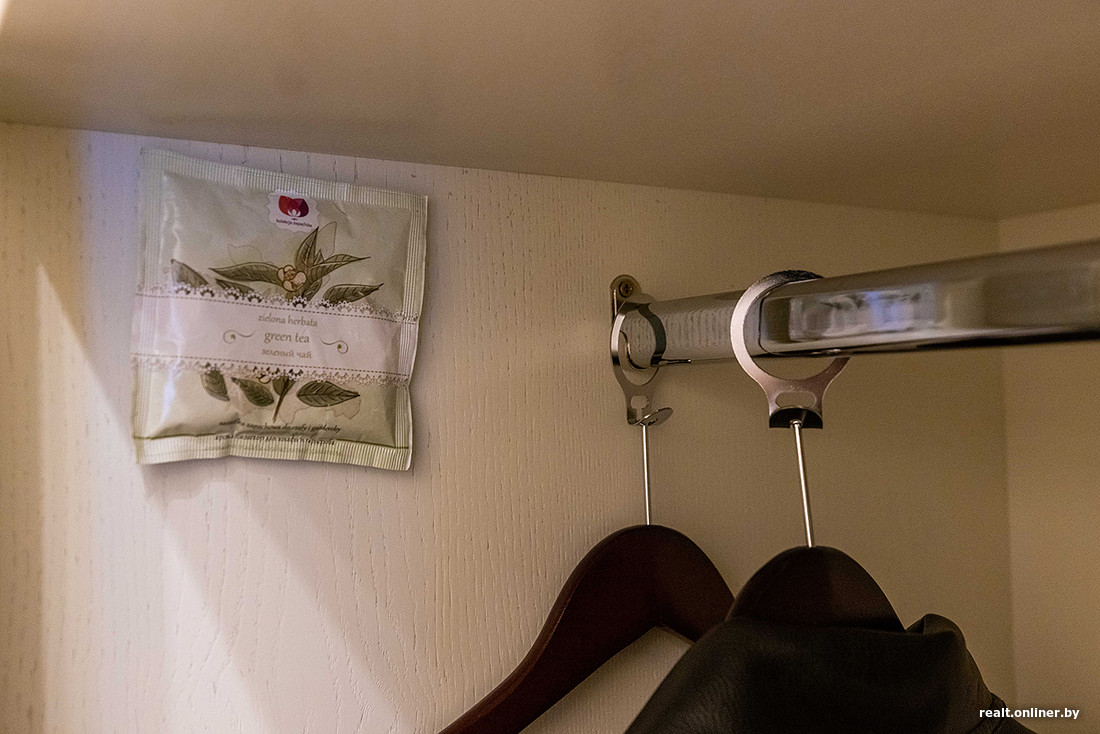 Следом проходим в гостиную с кожаными диванами (и еще одним бархатным — идеально подходит для фотосессий), телевизором, комодом и стульями. Из бытовой техники — мини-холодильник и электрочайник, к которому прилагаются две бутылки воды (с газом и без), пара чайных пакетиков и упаковок кофе «3 в 1».