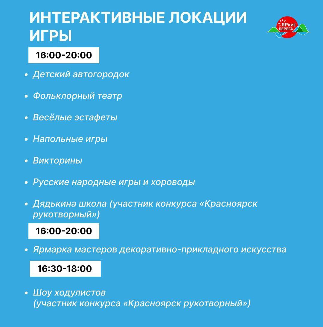 На набережной за сквером Энтузиастов красноярцы смогут погрузиться в народное творчество, поучаствовать в играх и конкурсах «Девичья краса — длинная коса», «Богатая борода», «Нарядная девица» и «Богатырская сила».