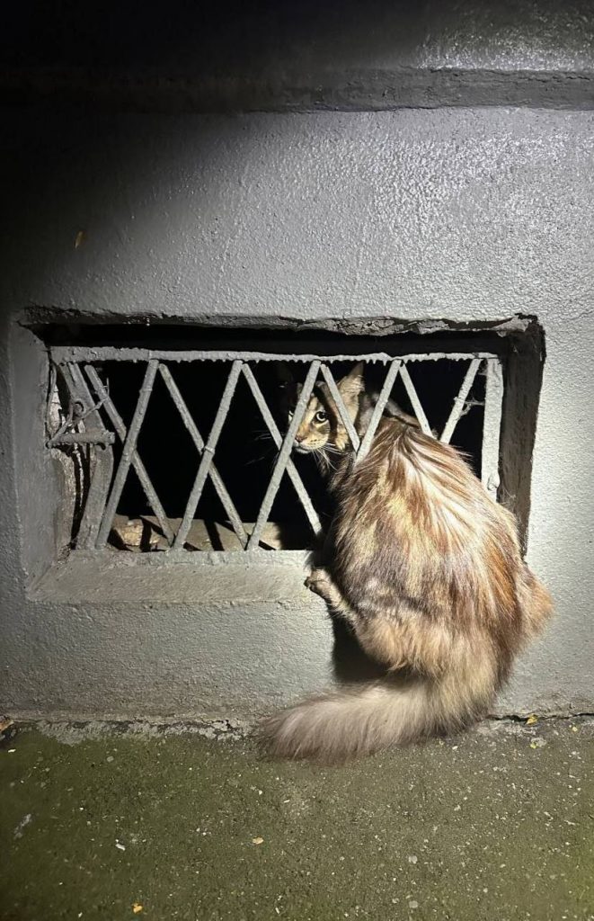 Кота породы мейн-кун, у которого застряла голова в подвальной решетке, спасли на Дмитровском шоссе, об этом сообщает Telegram-канал «Москвач».