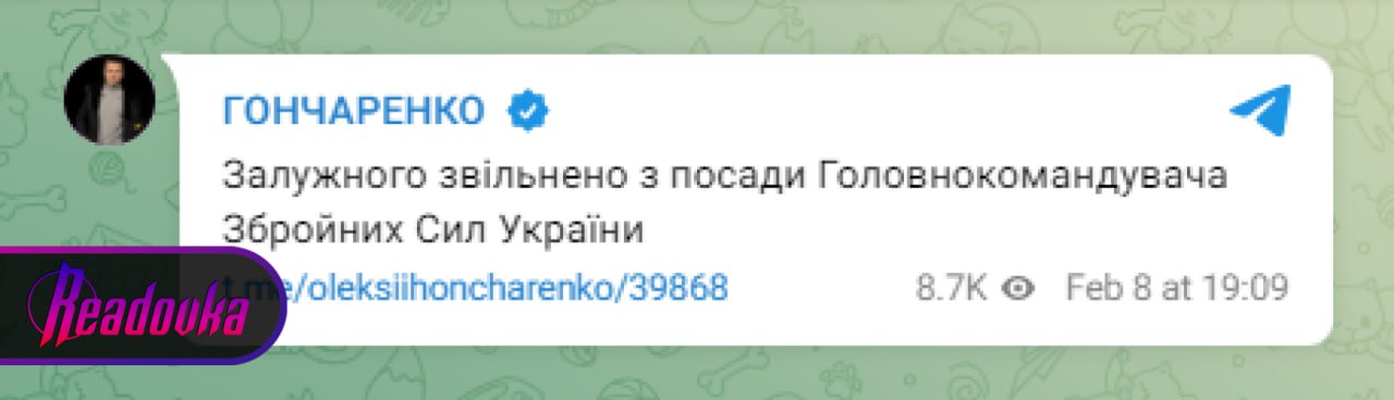 ❗️Залужный уволен с поста главкома ВСУ — депутат Гончаренко*