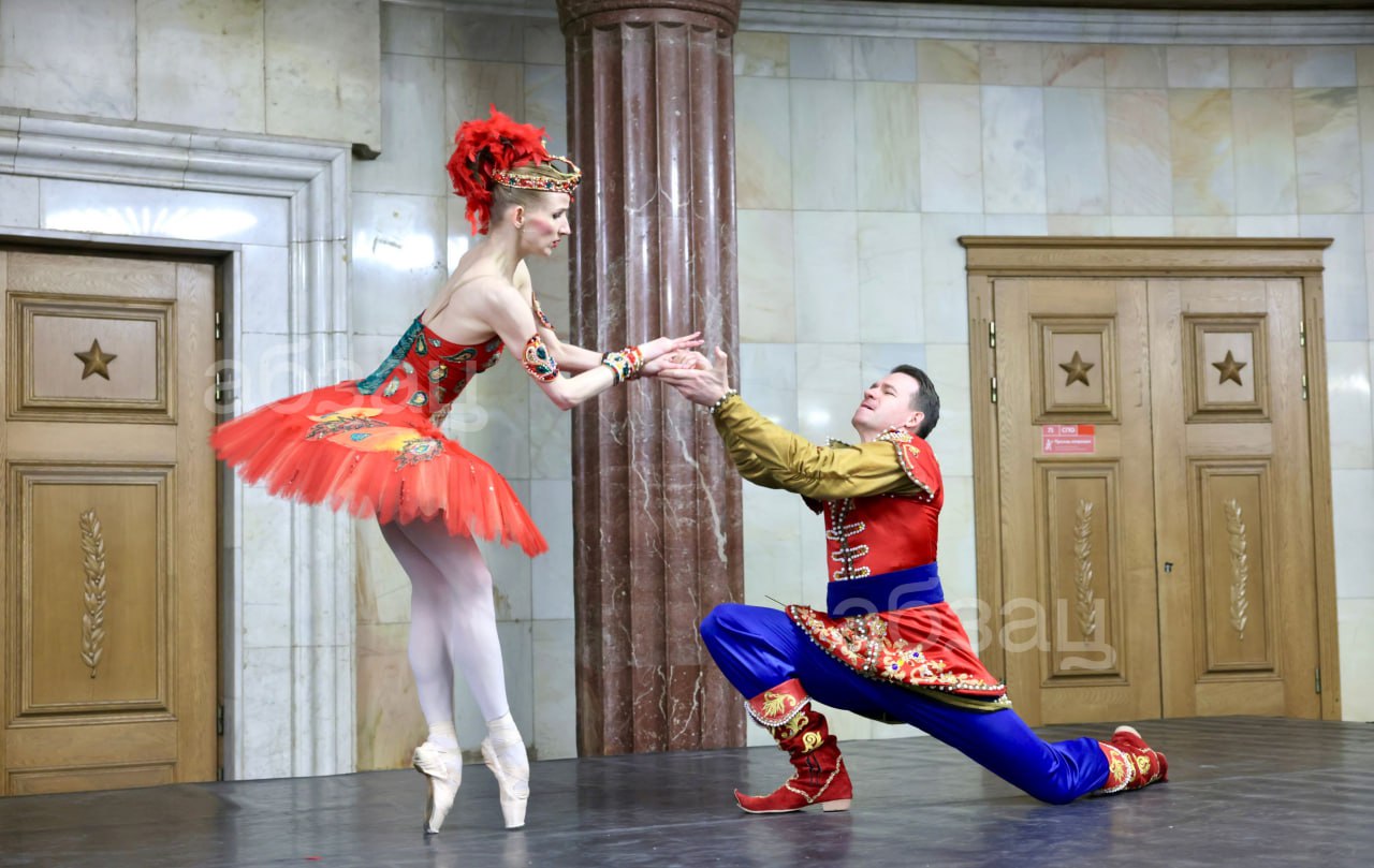 В честь праздника на станции «Курская» для пассажиров профессиональные танцоры балета исполнили сцены из знаменитых спектаклей «Лебединое озеро», «Спящая красавица» и других.