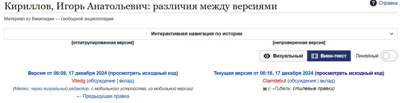 ❗️ Украинский ЦИПсО начал вносить правки в статью об Игоре Кириллове на Википедии в те же минуты, когда появились первые сообщения о его гибели