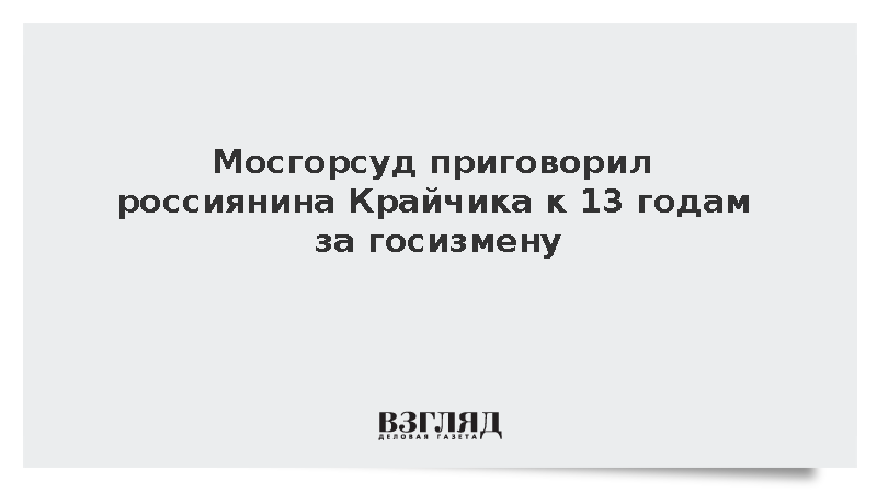 Мосгорсуд приговорил россиянина Александра Крайчика к 13 годам колонии строгого режима за государственную измену, передает РИА «Новости». В пресс-службе суда отметили, что Крайчик оказывал финансовую помощь иностранному государству, деятельность которого была направлена против безопасности России. Суд постановил, что действия Крайчика были мотивированы политической и идеологической ненавистью.