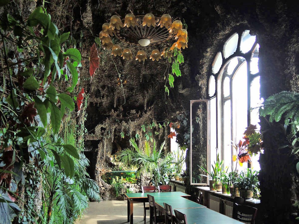 Зимний сад в особняке представлял собой грот, с потолка которого свисали сталактиты. Мюфке облицевал здесь стены природным ракушечником и украсил их вьющимися растениями.