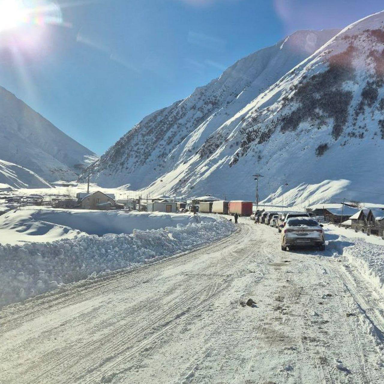 Огромные пробки скопились на границе России и Грузии в обе стороны из-за сильных снегопадов.