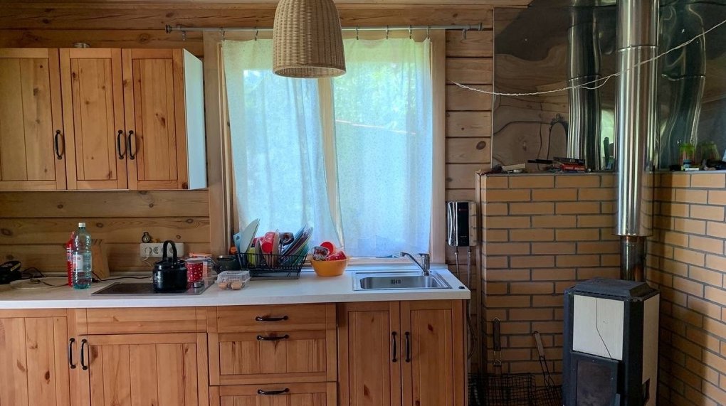Дом на «дачном» участке также с верандой и дровяной печью. Есть второй мансардный этаж.