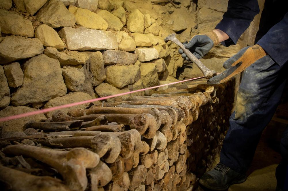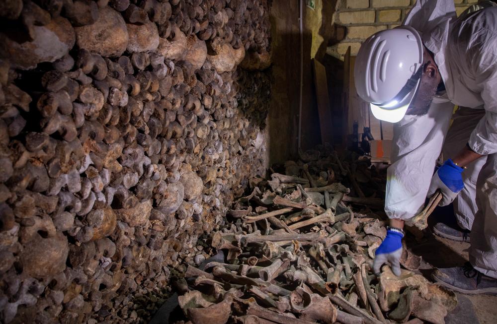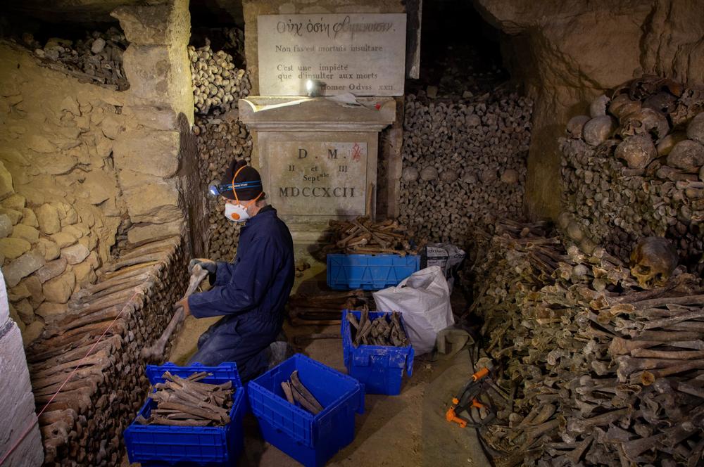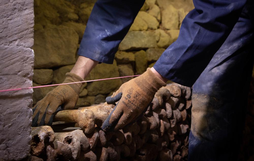 Martin Muriot, murailler de son état, est penché sur un tas de fémurs marron. Voilà trois jours qu'il tente de recomposer la hague des «Martyrs de septembre» des Catacombes de Paris, composée de dizaines de fragments de squelettes anciens. «D'ordinaire, je travaille sur la pierre de Bourgogne, explique-t-il, un crâne à portée de main. Mais nous sommes en train de tester une nouvelle méthode scientifique de conservation pour ces ossements.»