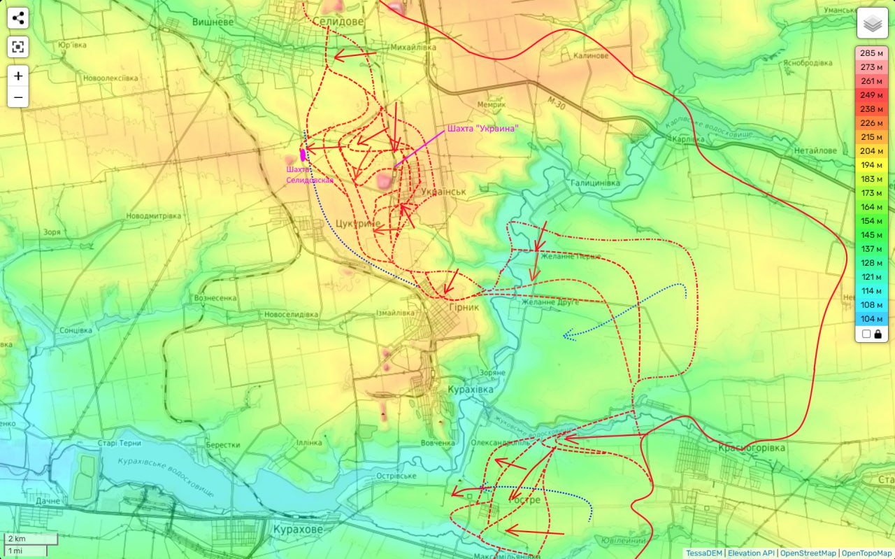 Одновременно с этим явно готовится штурм шахты «Селидовская». Утеря контроля над ее терриконом со стороны противника откроет нам путь не только на запад, но и юг и север от этой точки.