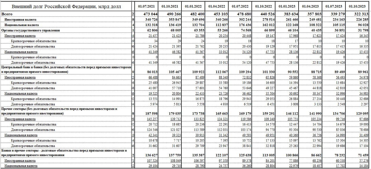 Внешний долг России снизился до $322 млрд на 3кв23 – минимум за 16 лет, сократившись на $160 млрд с момента начала СВО.