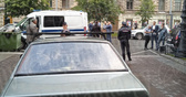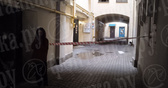 Автомобиль подозреваемого в поджоге военкомата на Чайковского в Петербурге остался стоять на улице, прямо у места преступления. Обгоревшая деревянная дверь военкомата открыта, видно, что серьезных повреждений получить она не успела.