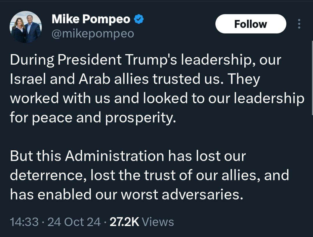 ©️ «Во время правления президента Трампа наши израильские и арабские союзники доверяли нам. Они работали с нами и рассчитывали на наше лидерство в плане мира и процветания. Но эта администрация утратила наше сдерживание, утратила доверие наших союзников и дала волю нашим злейшим противникам», — экс-директор ЦРУ и госдепартамента США Майк Помпео.