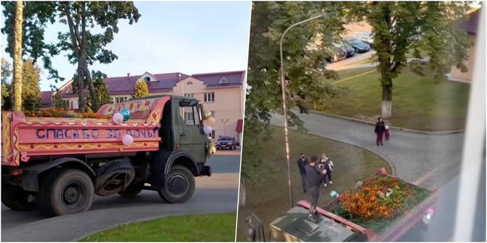 Судя по комментариям под видео, история произошла в Молодечно. Видно, как новоиспеченный папа подруливает к зданию роддома на грузовой машине, доверху заполненной цветами. Кузов грузовика, видимо, специально к этому событию окрасили в розовый цвет, на нем было написано: «Спасибо за дочь!»