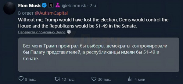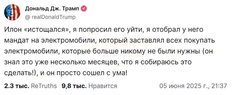 В ответ Маск пошёл ва-банк и заявил, что без его поддержки Трамп не выиграл бы выборы (по некоторым данным, глава Tesla вложил $290 млн в его возвращение в Белый дом).