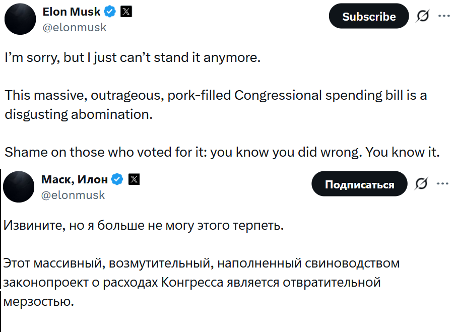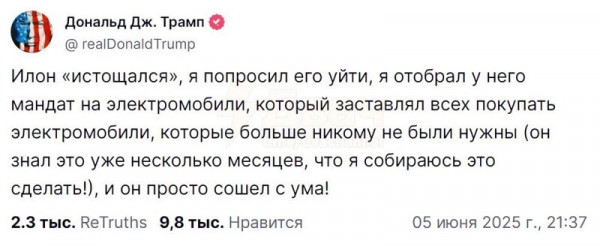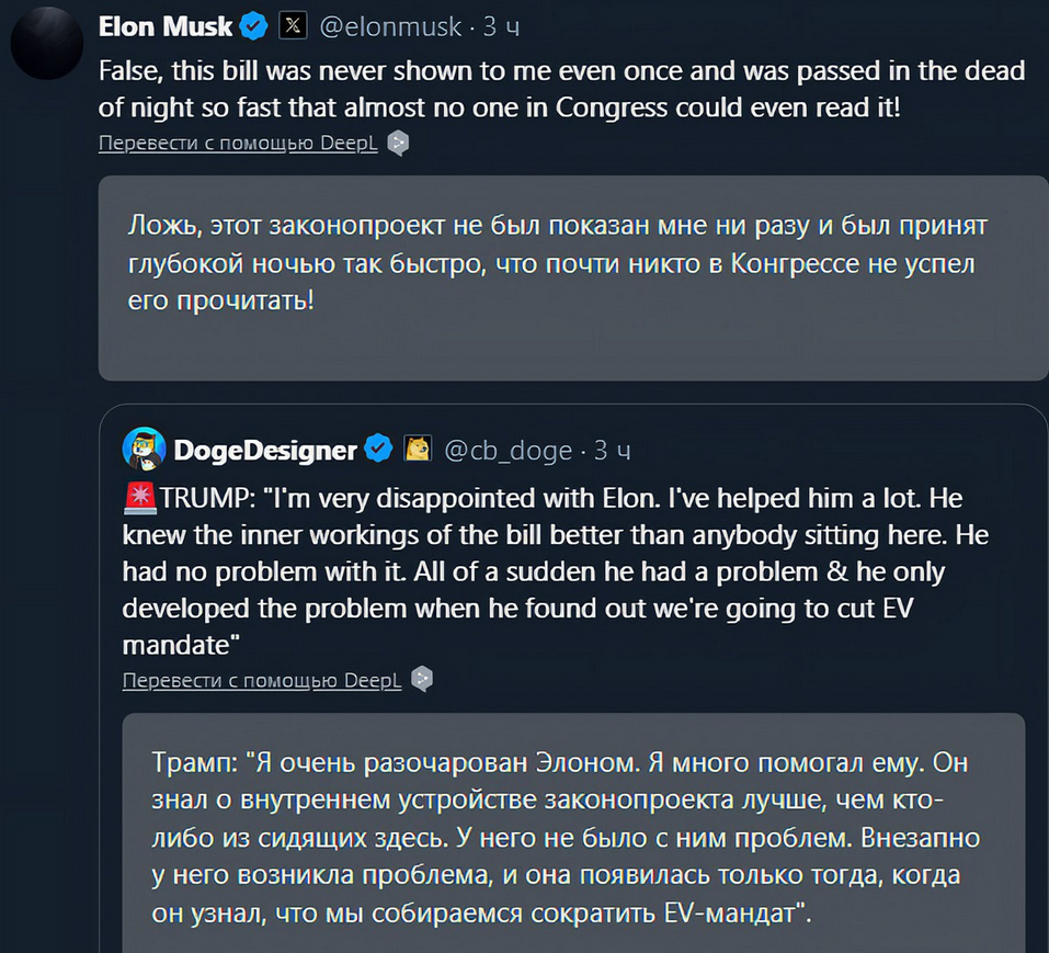 Трамп уверен, что вся эта буча с законопроектом возникла из-за того, что в нём нет нужных Илону Маску мер. В свою очередь он сообщил, что знает, как сэкономить миллиарды - достаточно отменить субсидии и госконтракты Илона, добавив, что удивлён тому, что "Байден этого не сделал!".Компания Маска действительно работает с правительством, получая субсидии и налоговые льготы, однако такой пассаж от президента вынудил владельца Tesla заявить, что SpaceX "немедленно начнет выводить из эксплуатации корабль Dragon" (используется для доставки грузов и астронавтов на МКС).Позже, правда, смягчился и заявил, что "Dragon останется".