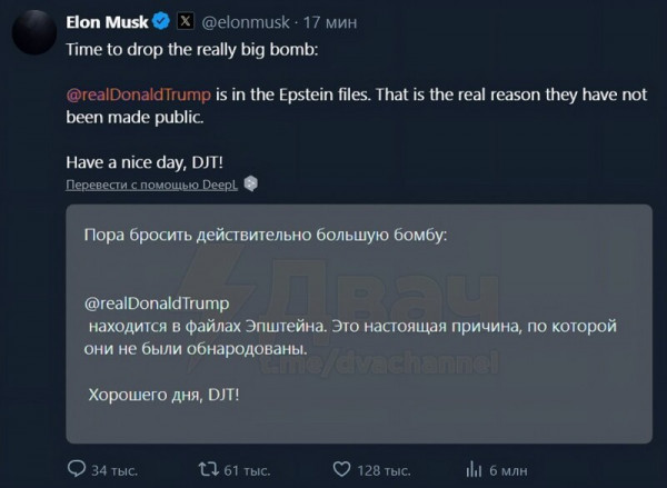 Также он репостнул один из твитов, призывающих к отставке Трампа, а потом и вовсе обвинил Трампа в связях с Джеффри Эпштейном, которого судили за торговлю детьми, заявив, что имя Трампа есть в файлах Эпштейна. Кстати, президент еще до вступления в должность обещал опубликовать документы по делу Эпштейна, но после того, как стал главой США, выложил только старые материалы, где сам он не упоминается;