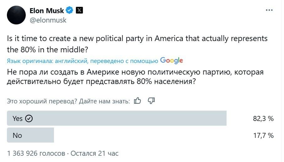 После этого спича Маск запустил опрос: "Пора ли создать в Америке новую партию, которая реально представляет 80% людей в центре?".
