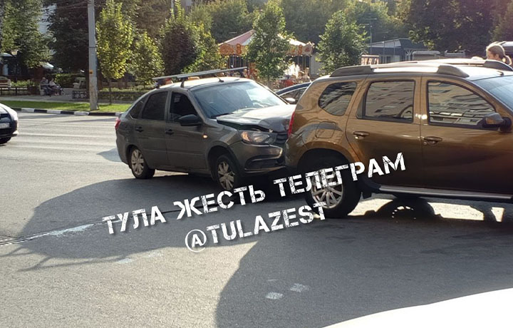 Как сообщили очевидцы происшествия в Telegram-канале «Тула Жесть», женщина-водитель на автомобиле «Лада Гранта» снесла дорожный знак и врезалась в попутный автомобиль «Рено Дастер».