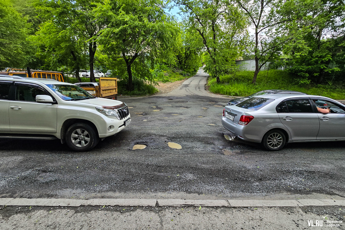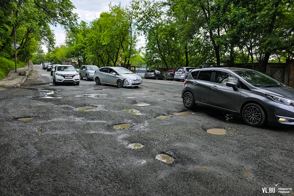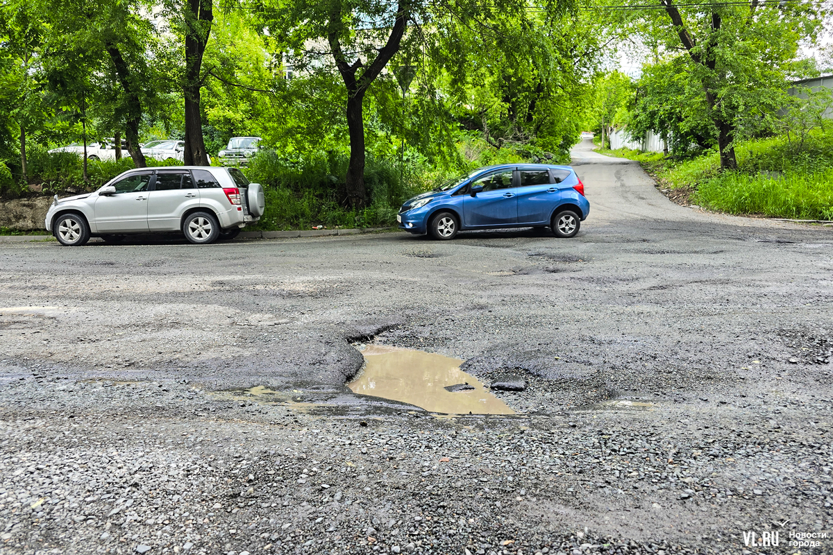 На Днепровской, 45 течь неизвестного происхождения как минимум с зимы уничтожает дорогу, но до настоящего времени никто ничего не сделал – даже воду не отводят. В декабре прошлого года вода начала сочиться с косогора с люком. Натекала на дорогу, примерзала, потом таяла. Администрация Владивостока отвечала, что проблему вот-вот устранят. Наступила весна, и на проезжей части уже была маленькая локальная катастрофа, но по встречке ямы ещё можно было обрулить.