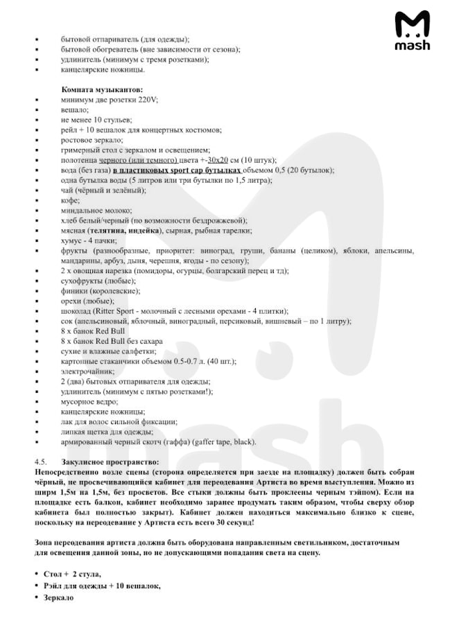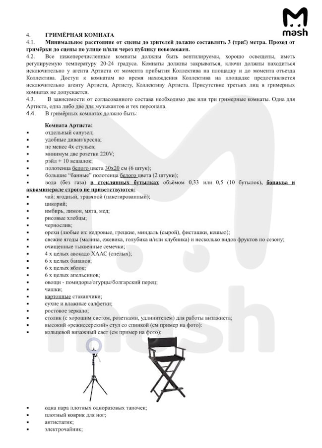 В гримерке всё стандартно: чай, имбирь, лимончик, мята, мёд, фрукты. Самое интересное — закулисное пространство. Это должен быть чёрный кабинет, в котором стыки нужно проклеить чёрным и красным тейпом. Чтобы вот вообще темно-темно и никаких посторонних людей. И, естественно, на концертах за 75+ тысяч евро запрещено снимать и выкладывать куда-либо.