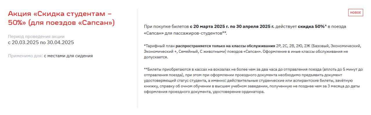 🚆 Студенты смогут ездить на «Сапсанах» вдвое дешевле, но есть нюанс — билет нужно купить не более чем за 2 часа до отправления.