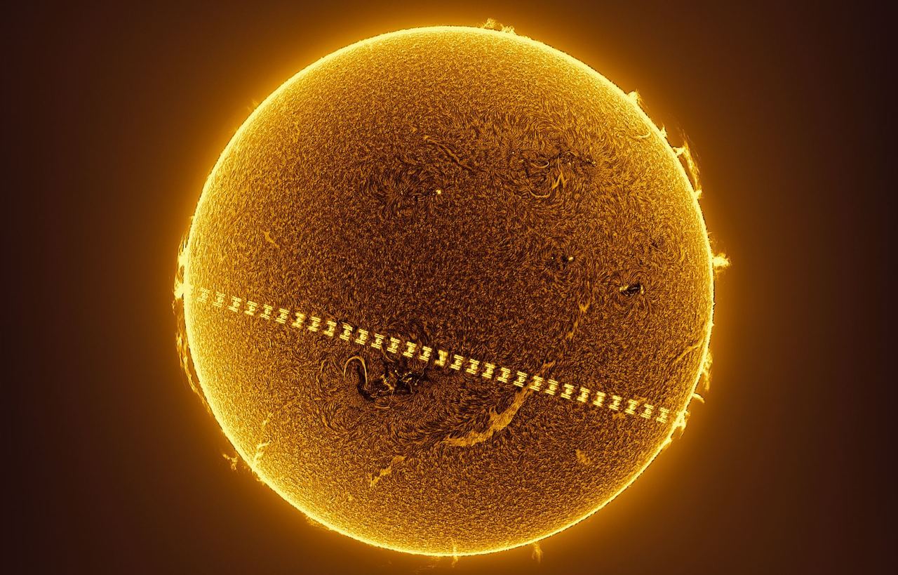 Каждый кадр Мигель обрабатывал отдельно. Детализация поражает: помимо самой МКС видно множество протуберанцев и солнечных пятен.
