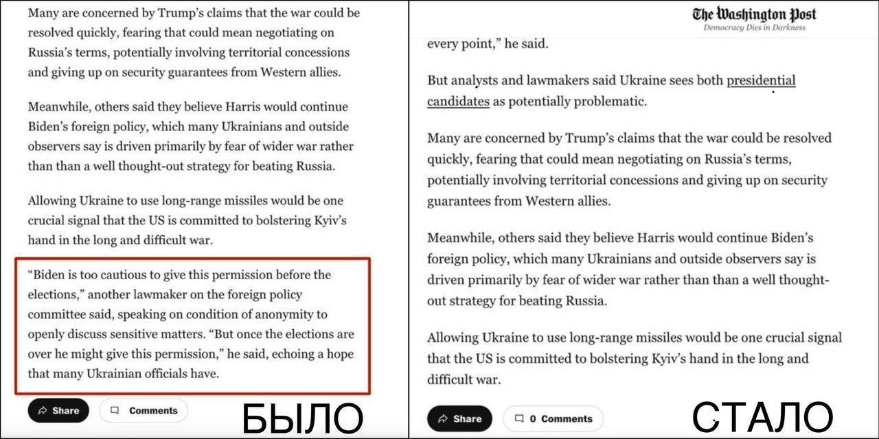 и Washington Post пропал абзац о том, что Байден может дать Украине разрешение на дальнобойные удары по РФ после выборов в ноябре.