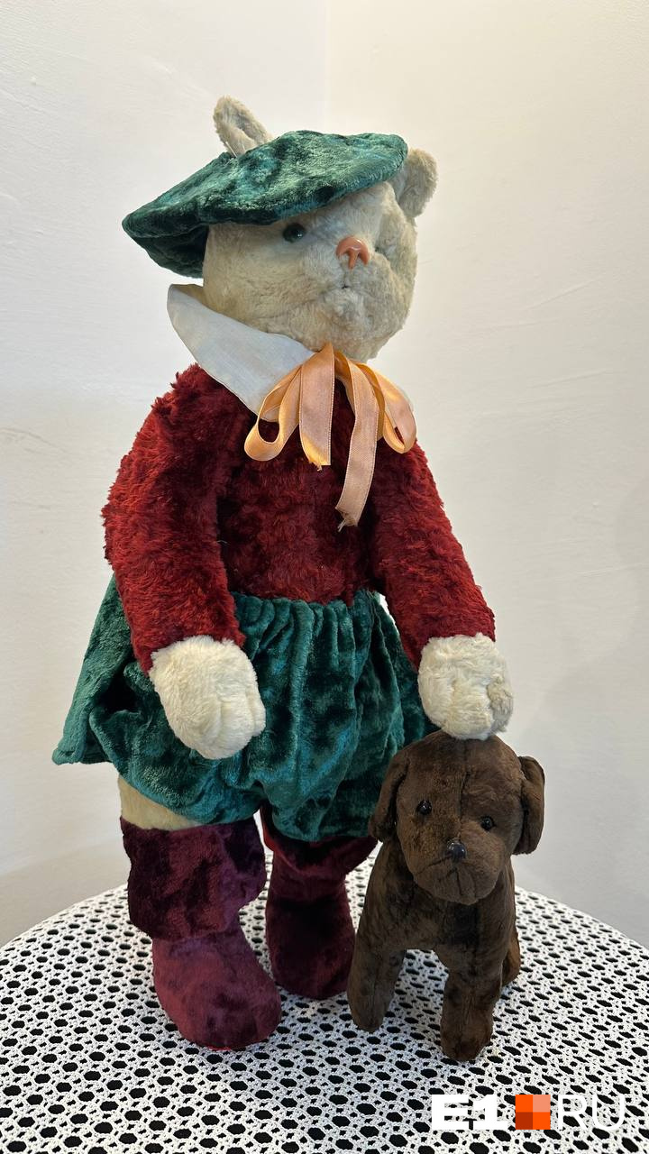 На просьбу рассказать о самых необычных предметах в коллекции Арина показывает нам очаровательного кота в сапогах, сделанного из опилок аж в 1940-х.