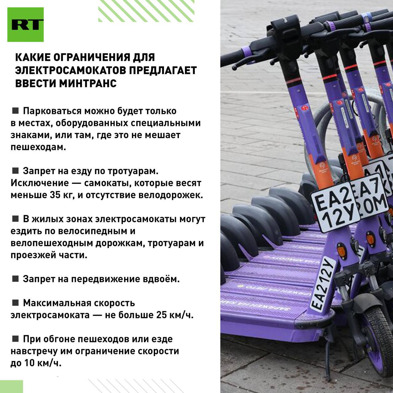 Минтранс предложил установить дорожные знаки для парковки электросамокатов, ограничить их скорость до 25 км/ч и запретить езду по тротуарам.