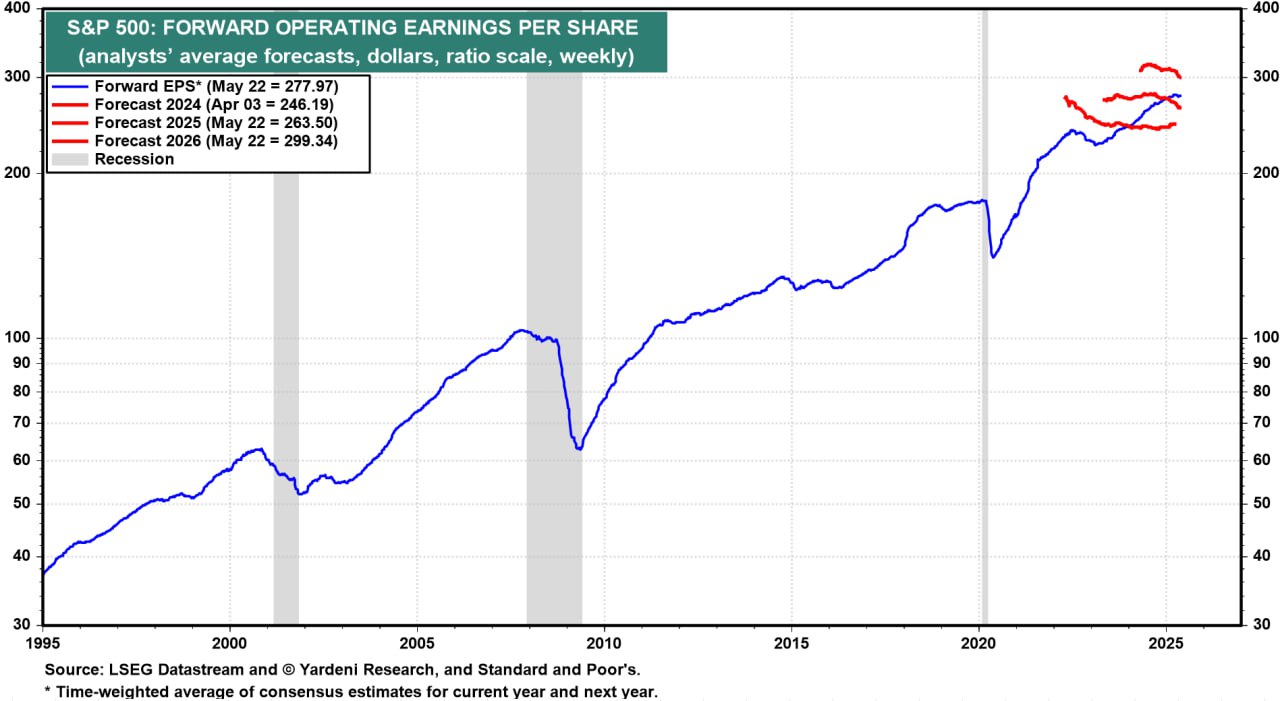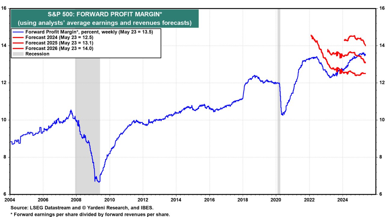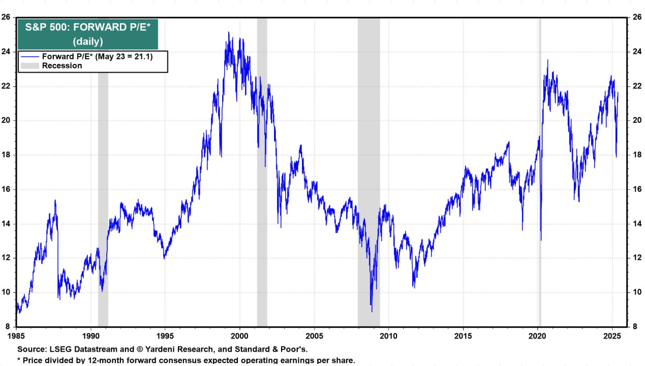 Текущий (на 27 мая) форвардный P/E компаний S&P 500 составляет 21.4, что находится в области средних значений экстремального пузыря 2021 и 2024 и почти сопоставимо с пузырем доткомов 1999–2000 (среднее значение около 23.3, а диапазон 21-25).