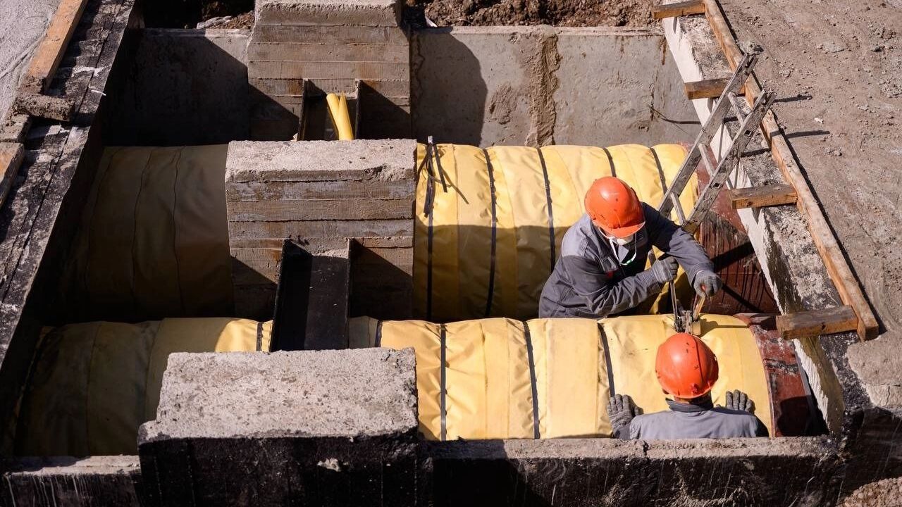 Трубы тепломагистрали сварены и укутаны плотным изоляционным слоем. Чтобы исключить попадание воды, канал, в котором они расположены, закрыли защитным слоем.