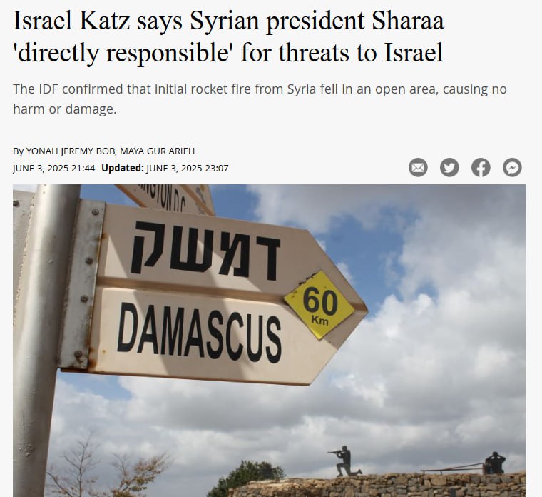 Израильский министр обороны Исраэль Кац возложил на президента Сирии Ахмеда аль-Шараа «непосредственную ответственность за каждую угрозу и обстрел» в сторону Израиля. Это заявление последовало в ответ на ракетный обстрел из южной Сирии во вторник вечером. Об этом сообщает The Jerusalem Post.