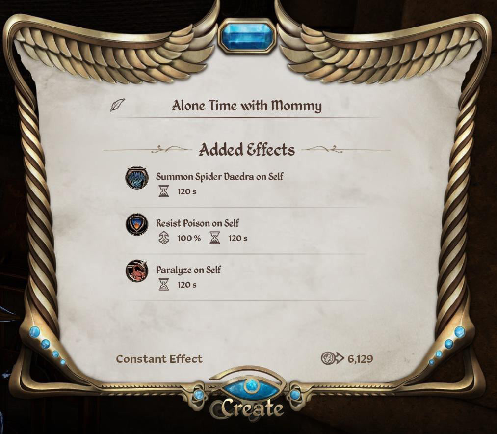 А вот и самая интересная часть: заклинание призывает Даэдра-паука – жуткое, возвышающееся сочетание женщины и паука, прямо к игроку. Почему? И название у спелла соответствующее: "Наедине с мамочкой".