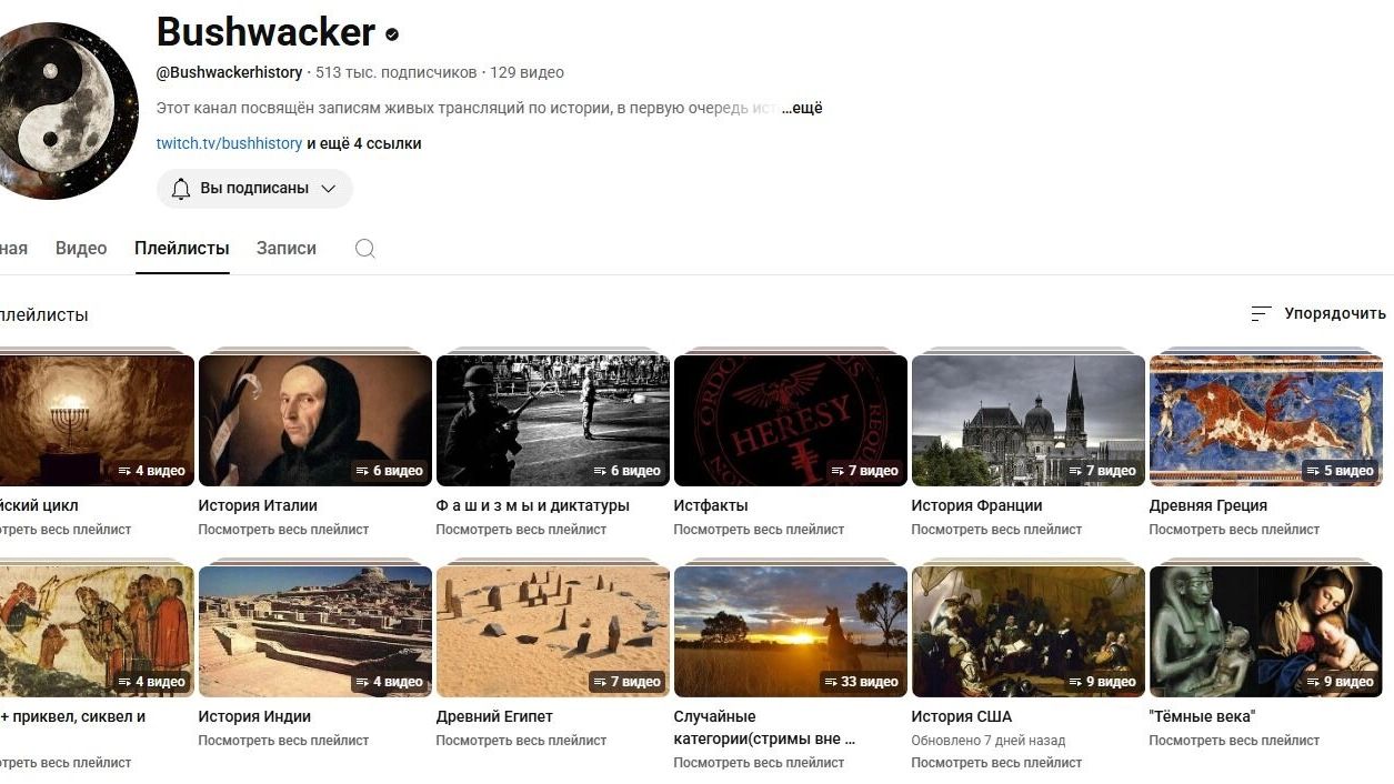 Канал под названием «Бушвакер», где обычный человек, получивший высшее историческое образование, читает лекции по общей истории.