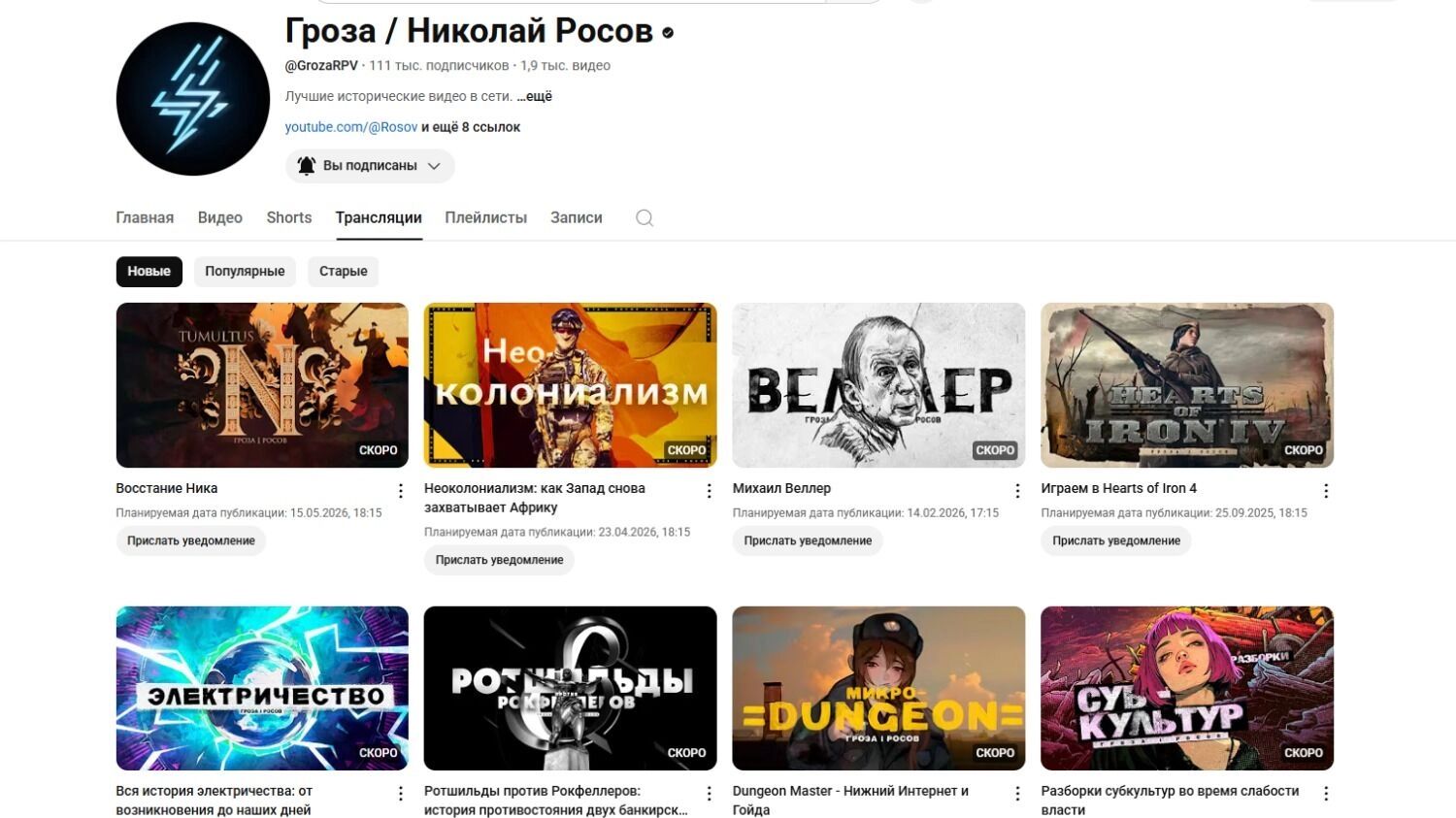 Основной профиль канала — начало XX века, в частности предвоенные экономические отношения между Германией и СССР.