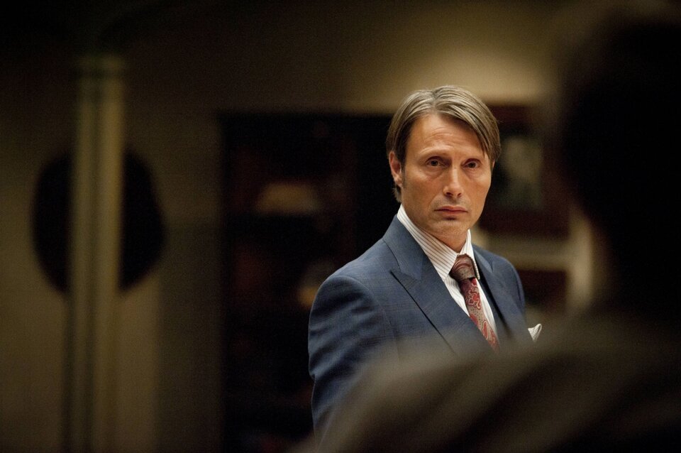 Символично и монументально первое появление сериального Ганнибала в кадре: под Гольдберг–вариации Баха в полумраке за обеденным столом с изысканной сервировкой постепенно появляется фигура человека в темно-коричневом костюме. Акцент на руках, разрезающих приборами кусочки мяса, и скульптурном лице Миккельсена с четко очерченными скулами. При такой игре света и тени косая челка Лектера рождает ассоциации с Адольфом Гитлером.