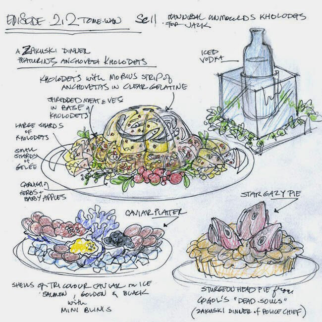 Пун составляла полноценные эскизы сервировки блюд. Например, вот так она расписала сервировку холодца из финала второго сезона. На эту zakuska ее вдохновило описание блюда из «Мертвых душ» Гоголя.