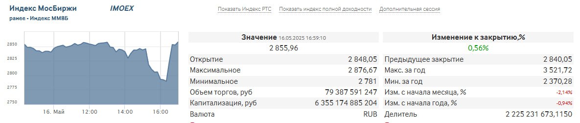 Правда, взлет сложно назвать устойчивым. Всего за пару минут прирост с 0,63% уменьшился до 0,56%. По данным на 16:58 мск, индекс снизился до 2855,96 пункта.