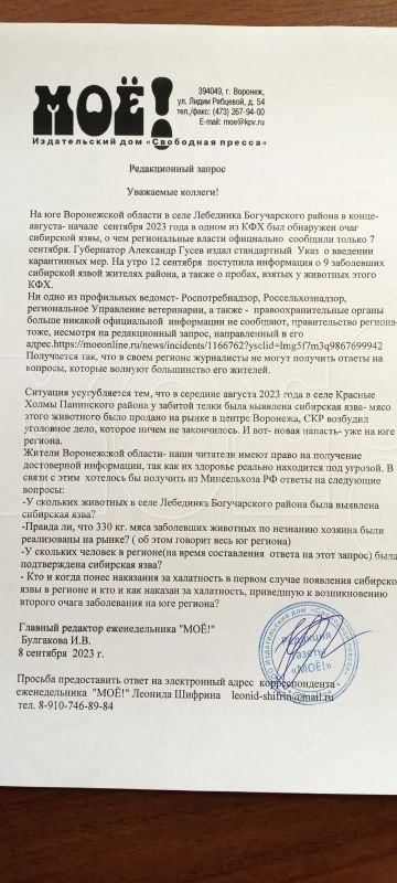 «МОЁ!» обратилась с запросом в Минсельхоз РФ по поводу вспышки сибирской язвы в Воронежской области