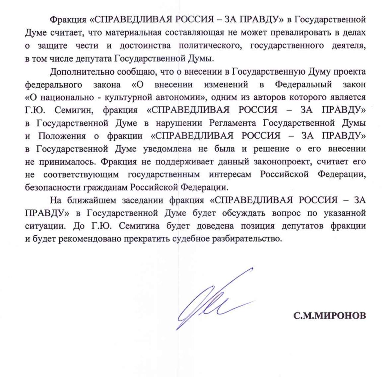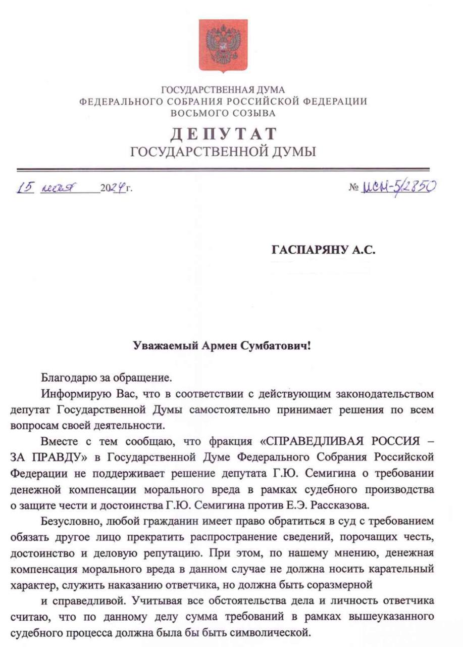 к председателю партии "Справедливая Россия/Патриоты/За правду" по поводу иска депутата Госдумы Семигина к участнику СВО на сумму 6 миллионов рублей.