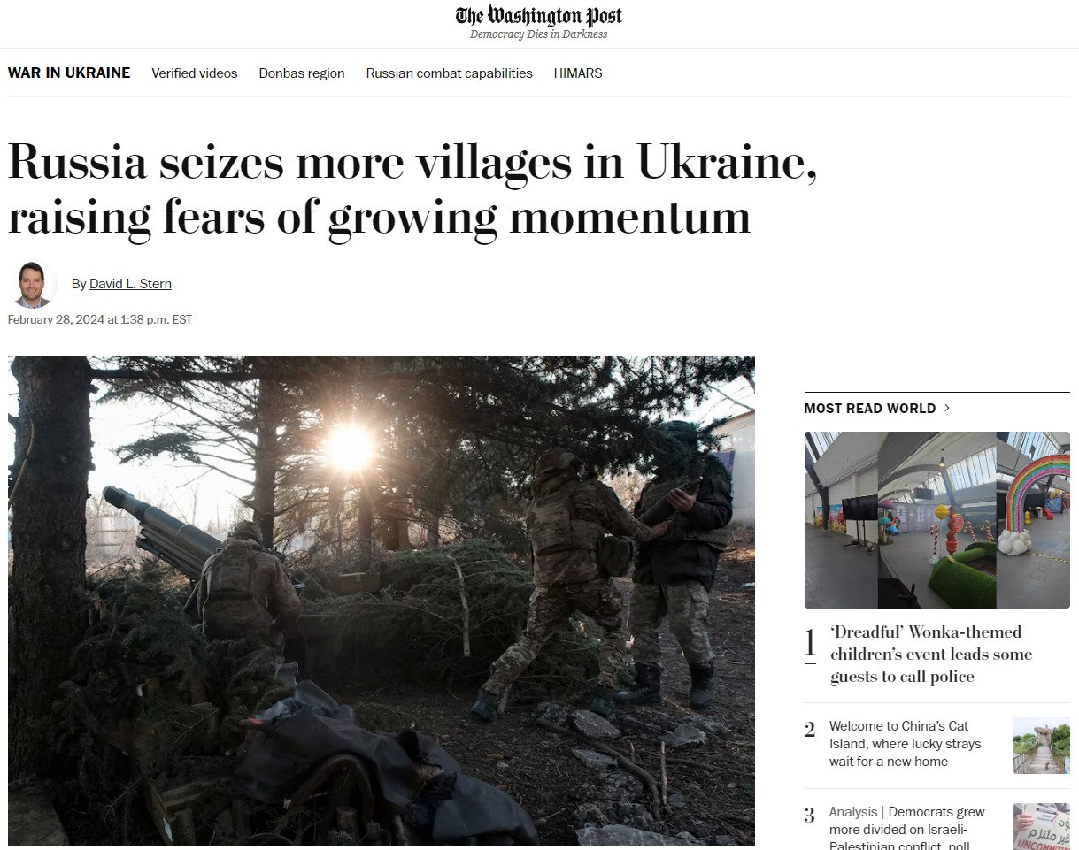 После взятия Авдеевки российские войска захватили ещё три деревни всего за последние несколько дней, что говорит о "растущей динамике их продвижения", утверждает The Washington Post. И, хотя эти населённые пункты не настолько стратегически важны, как та же Авдеевка, "эти успехи наглядно свидетельствуют о том, что Россия наращивает своё преимущество".