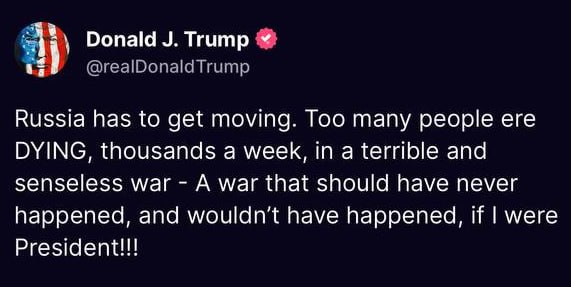 — России пора начать действовать. Слишком много людей погибает — тысячи каждую неделю — в этой ужасной и бессмысленной войне. Войне, которая никогда не должна была начаться и которой бы не было, если бы я был президентом!!!
