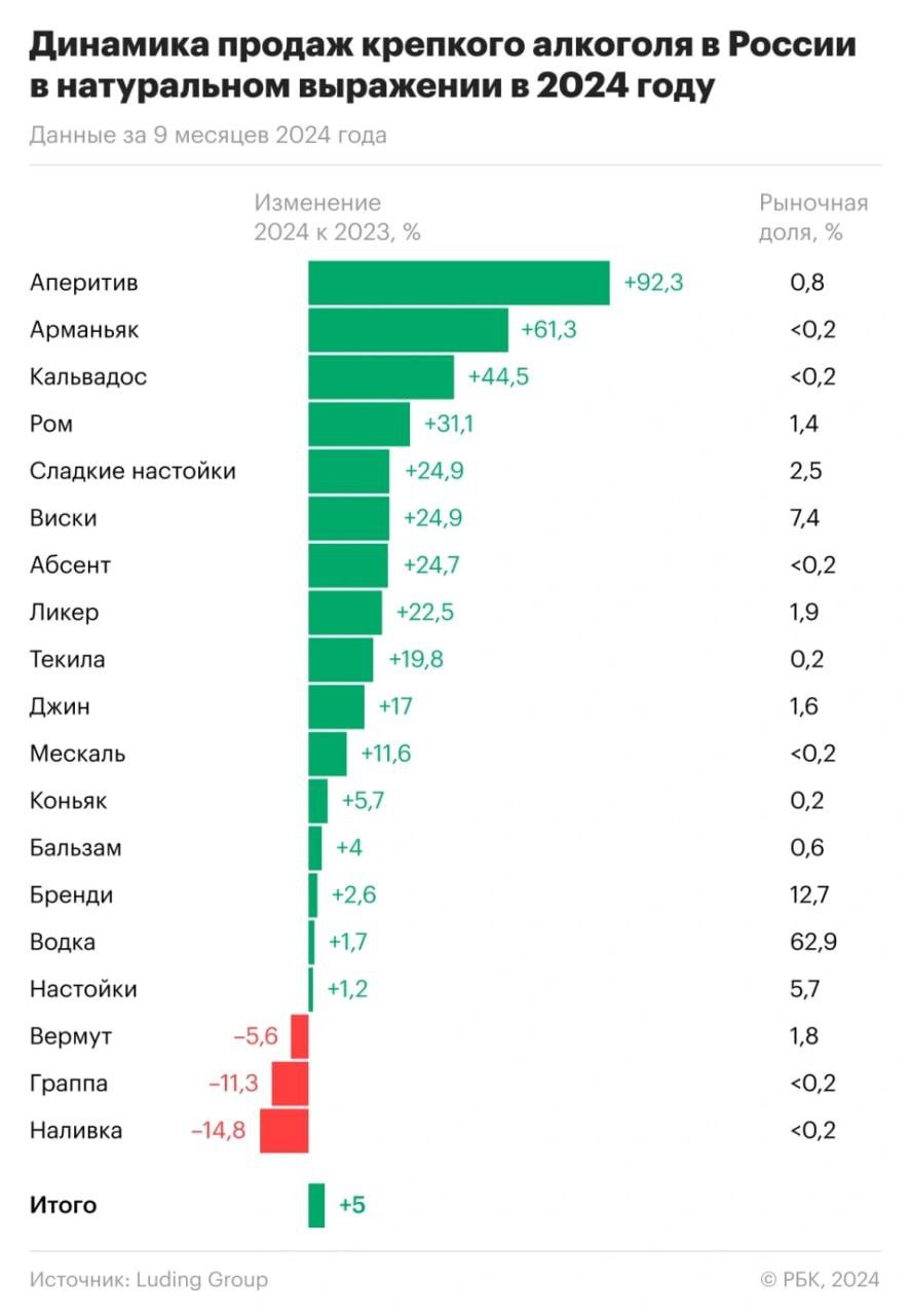 Но россияне не спиваются глуша водку. В крупных сегментах крепкого алкоголя больше всех выросло потребление исторически французского арманьяка и кальвадоса. Также россияне стали больше пить дорогие коктейли - вырос спрос на составляющие их аперитивы (апероль, кампари). @banksta